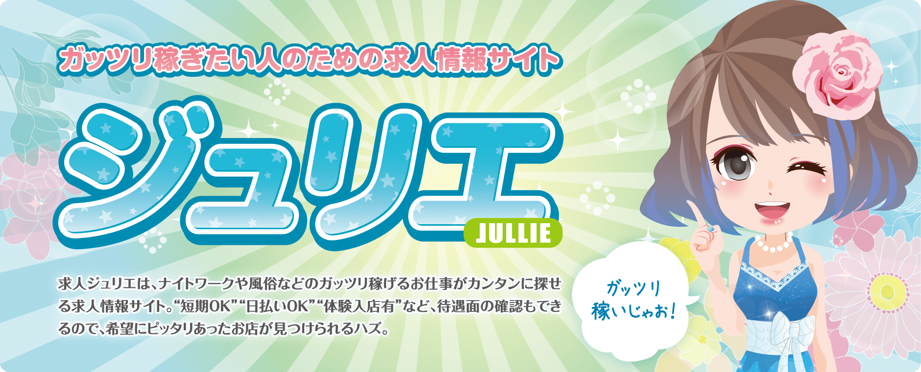 求人ジュリエは、ナイトワークや風俗などのガッツリ稼げるお仕事がカンタンに探せる求人情報サイト。“短期OK”“日払いOK”“体験入店有”など、待遇面の確認もできるので、希望にピッタリあったお店が見つけられるハズ。