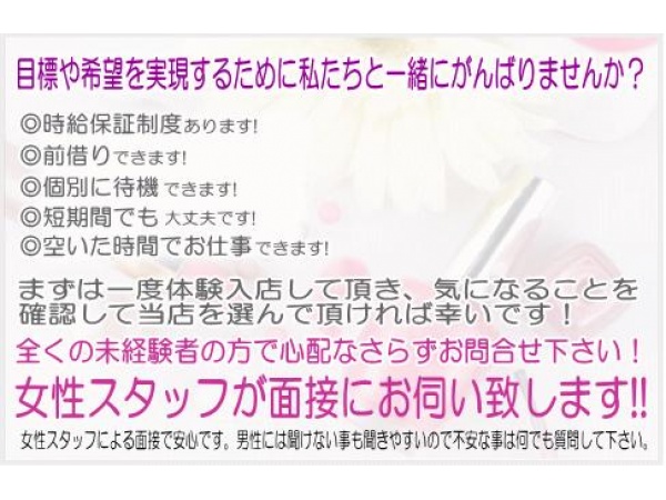 | 勤務日 | 完全自由出勤(月数回の出勤・短期アルバイト・体験入店OK) |