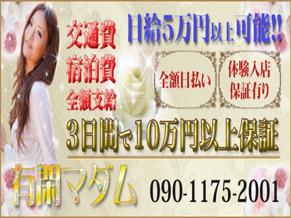 | 仕事内容 | デリバリーヘルス 稼げる高収入をお約束 【最低☆保証制度】 ☆体験入店をして頂いた貴女には最低保証金として☆ ★1日の保証金額 30,000円 ★3日の保証金額 100,000円 ★7日の保証金額 200,000円 ☆上記以上の金額をお約束致します!! ※1日8時間待機して頂いた場合、上記のお給料を最低額として当日来て頂いた日に確実にお渡し致します。 【お問い合わせ】 090-1175-2001 090-5717-6671 【問い合わせメール】 madam-2001@ezweb.ne.jp 稼ぎだい彼女! 必ず稼げます!! 必ず稼がせます!!! ご相談はお気軽にメールかお電話にてお待ちしております。 |